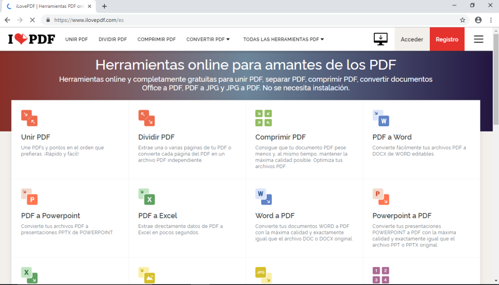iLovePDF es una herramienta online de uso GRATIS que permite convertir varios formatos de archivos a pdf o viceversa