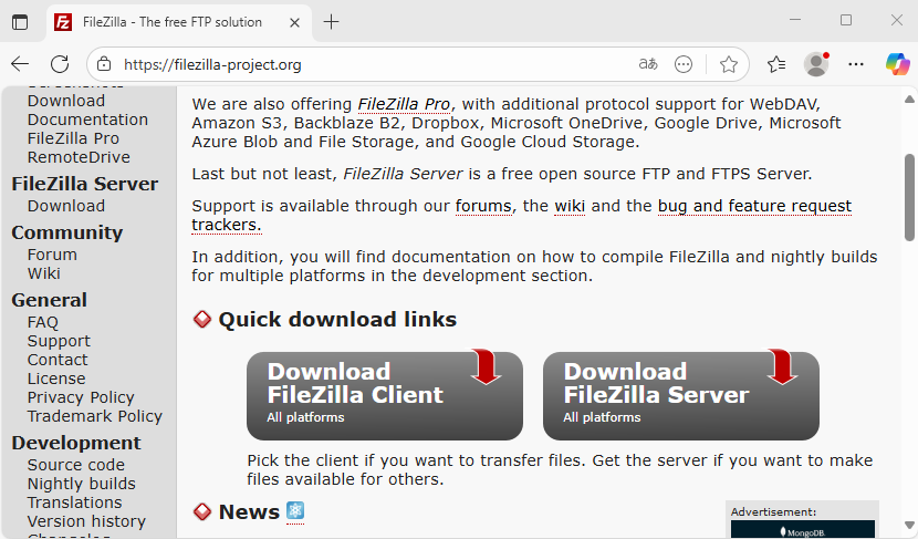 Haz clic en Download FileZilla Client y guarda el archivo en la carpeta que gustes, podría ser en la misma donde almacenaste el software de WordPress. Una vez guardado procede a instalar el programa en tu computadora, este debería ser el resultado: