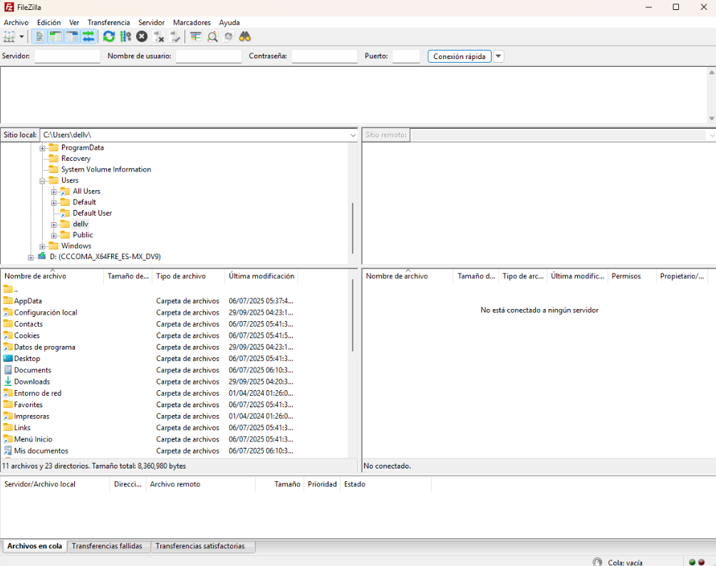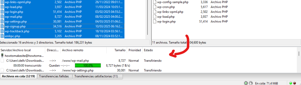 Sube los archivos: Una vez conectado, verás dos paneles en FileZilla: uno con los archivos de tu computadora y otro con los archivos de tu servidor.