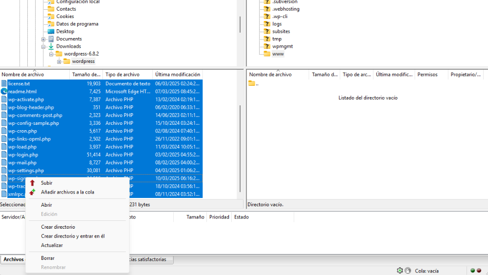 Ahora selecciona y en seguida arrastra y suelta todos los archivos y carpetas que estaban dentro de la carpeta WordPress de tu computadora al directorio raíz de tu servidor, o selecciona todos los archivos y da clic derecho sobre cualquiera y elige subir.