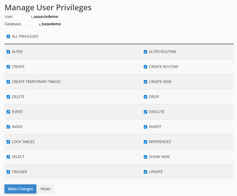 Asigna todos los privilegios a este usuario para que pueda interactuar correctamente con la base de datos. Esto es necesario para que WordPress pueda leer y escribir datos.