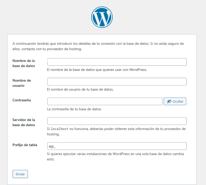 Ahora en el siguiente formulario, vas a agregar la información de tu base de datos, usuario y contraseña, recuerda que esto lo hicimos en el Paso 2: Crea la base de datos de WordPress y te pedí que anotaras esos datos. Una vez agregados da clic en Enviar