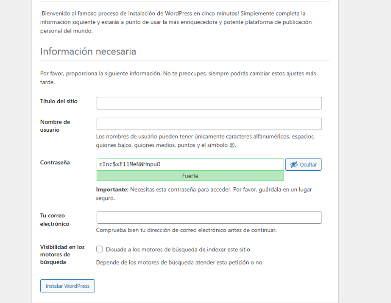 Nombre de Usuario (Admin Username): Elige un nombre de usuario que sea difícil de adivinar. Evita usar "admin" por motivos de seguridad. Ojo este será el usuario que más adelante ocuparemos para iniciar sesion, por lo que no lo debes olvidar, si es posible anotalo.