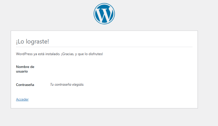 Si llegaste a este punto, tu instalación de WordPress esta lista, ahora solo debmos dar clic a "Acceder" y utilizar los datos de acceso que agregamos en el paso anterior
