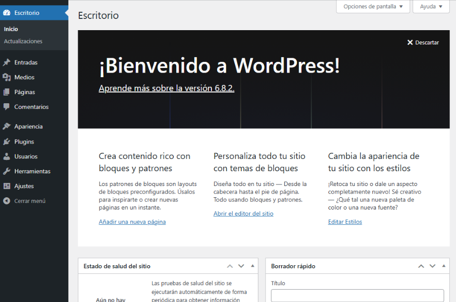 Una vez que hayas iniciado sesión serás redirigido al panel de WordPress