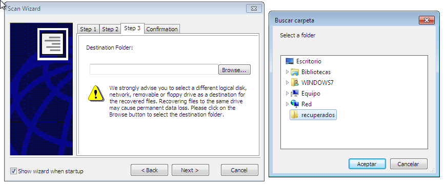 Para ello haz clic en BROWSE y selecciona la carpeta, para este ejemplo se creo una carpeta en el escritorio llamada "recuperados"