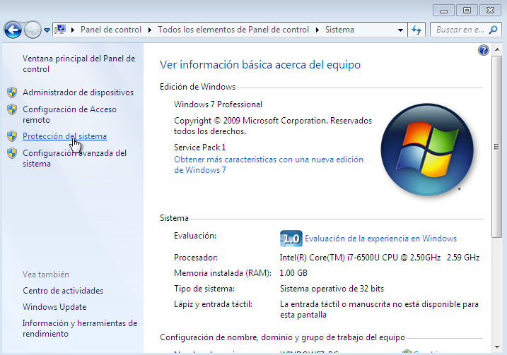 Accederemos a Sistema, que está dentro del panel de control, y vamos a acceder a la opción de protección del sistema.