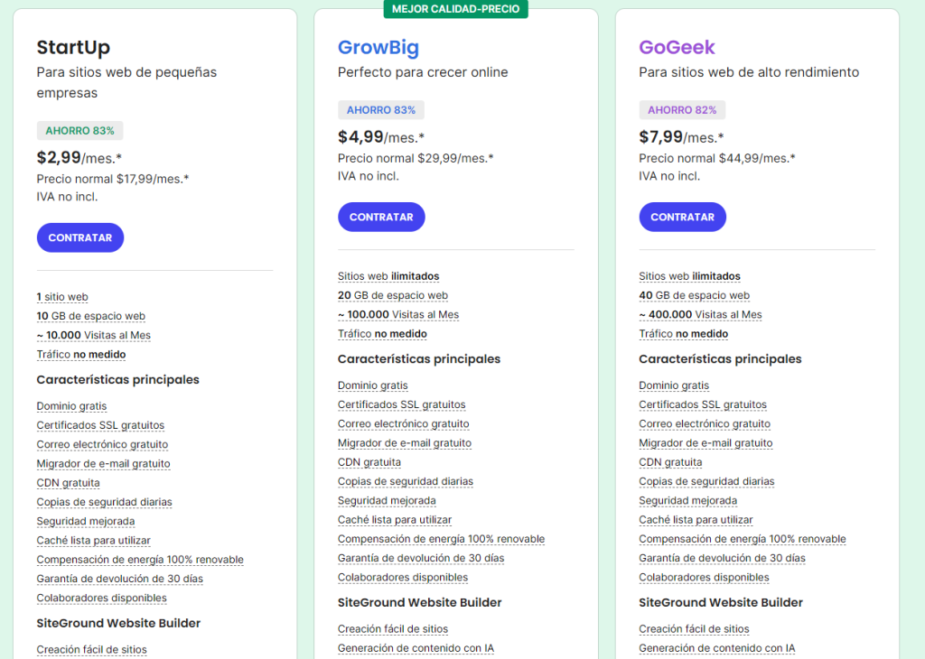 Aunque sus precios son más altos que el promedio, la justificación está en la calidad de servicio. SiteGround es particularmente recomendable para sitios de negocios donde el rendimiento constante y la seguridad son prioritarias. Su sistema de escalado automático maneja picos de tráfico sin problemas.