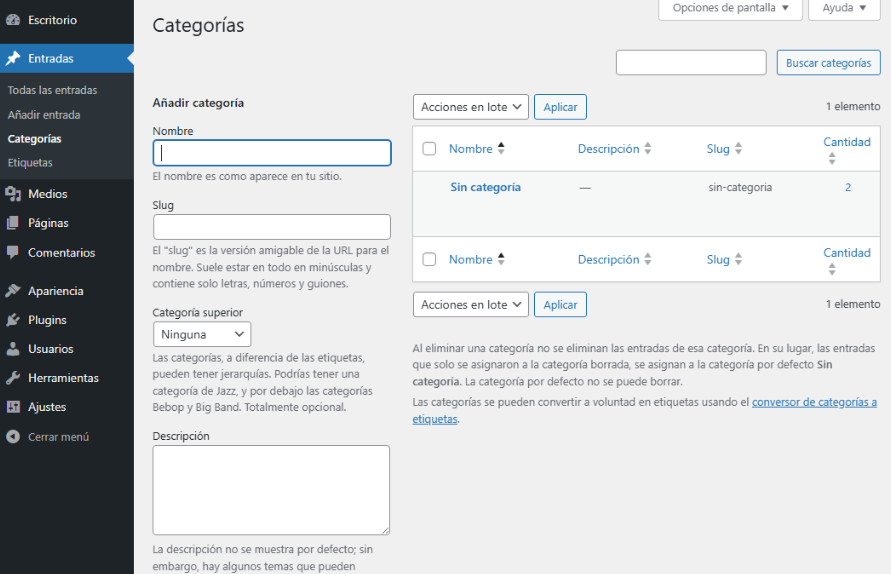 Cuando publicas una entrada y olvidas asignarle una categoría, WordPress le asigna automáticamente la categoría por defecto. Por defecto, esta categoría se llama "Sin categoría". Sin embargo, es una buena práctica cambiarla a una que sea más relevante para tu sitio.