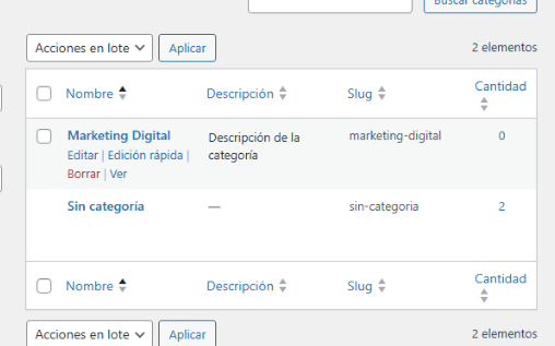 Edición rápida: permite modificar el nombre y el slug de la categoría