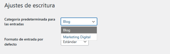 Para cambiar la categoría por defecto, ve a Ajustes > Escritura en el menú lateral. En la sección "Ajustes de escritura", verás la opción "Categoría por defecto para las entradas". Selecciona una de tus categorías existentes (como "Blog" o "Noticias") en el menú desplegable y guarda los cambios. De esta forma, cada nueva entrada que publiques tendrá una categoría relevante desde el inicio.