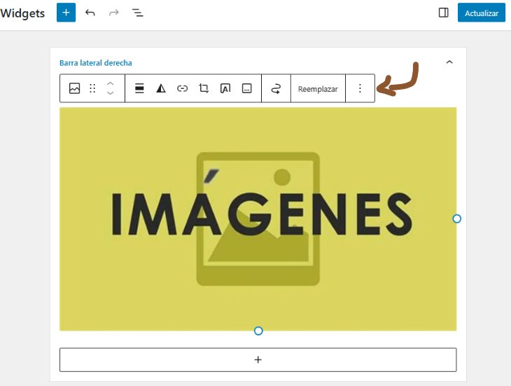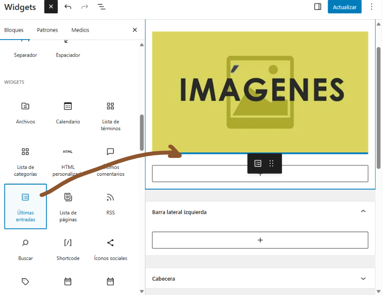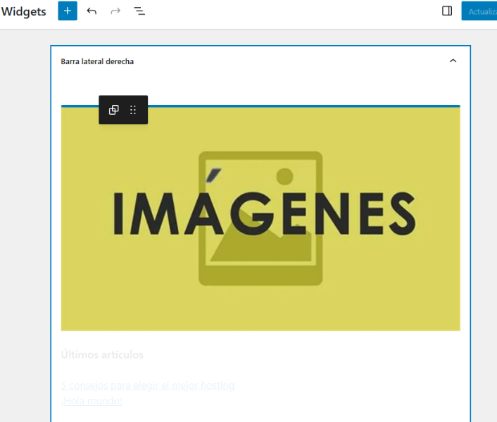 Para reordenar widgets: El editor de widgets moderno te permite arrastrar y soltar los widgets para cambiar su orden. Simplemente haz clic y arrastra el widget a una nueva posición dentro del área de widget que has elegido. También puedes usar las flechas hacia arriba y abajo que aparecen al seleccionar el widget para moverlo un bloque a la vez.