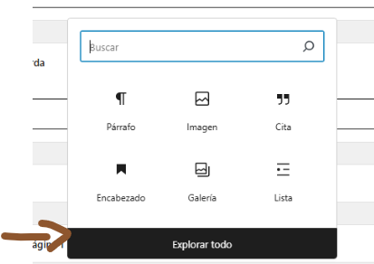 Puedes agregar los widgets que necesites, dando clic al icono +. Pero ahora veremos todos los widgets que proporciona por defecto WordPress, por lo que pulsaremos sobre "Explorar todo".