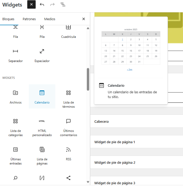 Barra lateral (Sidebar): El lugar más común para los widgets. Aquí puedes añadir listas de categorías, una barra de búsqueda, anuncios o un formulario de suscripción.