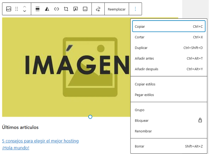 También se muestra un icono con 3 puntos, si das clic en el puedes ver más opciones disponibles para ese widget. Recuerda que las opciones pueden variar. En las siguientes imágenes puedes ver las propiedades del widget de imagen (izquierda) y el de ultimas entradas (derecha)
